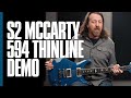The PRS S2 McCarty 594 Thinline is an all-mahogany, thin-body guitar with a powerful voice. It features a Pattern Thin mahogany neck with a 22-fret rosewood fingerboard. The guitar is equipped with PRS 58/15 LT pickups, offering both humbucking and single-coil tones thanks to its dual volume and push/pull tone controls.